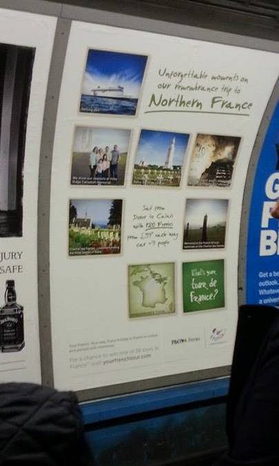 The centenary of the start of the First World War has caused a surge in battlefield tours. I snapped this photo yesterday while waiting for an underground train. It’s nice to see that one of the cross-channel ferry companies is cashing in on all of this WWI nostalgia. I noticed that they are encouraging Londoners to go visit Vimy Ridge rather than some other battlefield in France.