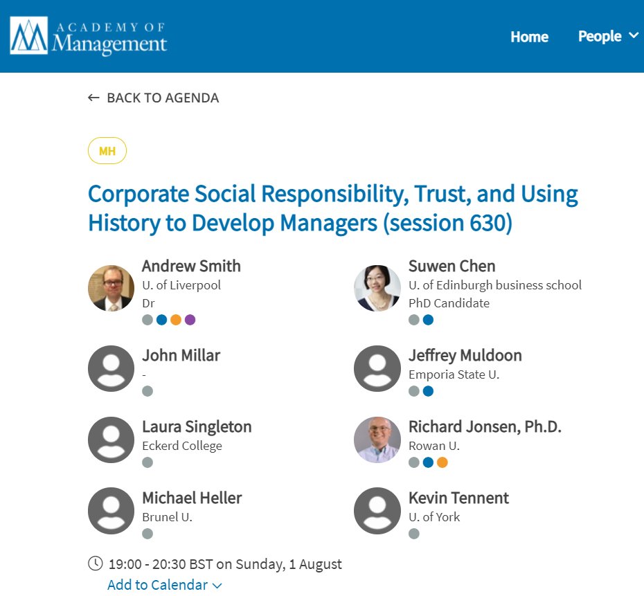 On Sunday evening (UK time), I’m going to be presenting my research at the Academy of Management virtual conference as part of a panel on Corporate Social Responsibility, Trust, and Using History to Develop Managers