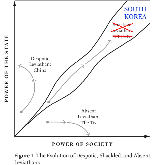 The Narrow Corridor argues that freedom and prosperity thrive when a delicate balance exists between the state and society—a “shackled leviathan.” In these countries (think the UK and the US), strong institutions ensure the state is powerful enough to govern effectively but also constrained by an engaged, organized society that can hold it accountable. In contrast, despotic leviathans have powerful states but weak societies (think China for most of the last thousand years), leading to oppression and authoritarian rule, while absent leviathans suffer from weak states and weak societies, leaving them mired in chaos and lawlessness (think Somalia or most tribal societies). The authors also emphasize that culture plays a huge role—societies don’t just randomly fall into one category or another. Historical events and cultural norms shape their trajectories, creating a kind of “path dependence” that makes it hard to break free from established patterns. That’s sort of true, but that theory makes it harder to explain what recently happened in South Korea. Having lots of Anglo-Saxon “cultural DNA” in a given country seems to matter less to its political institutions than the Narrow Corridor might lead you to believe.