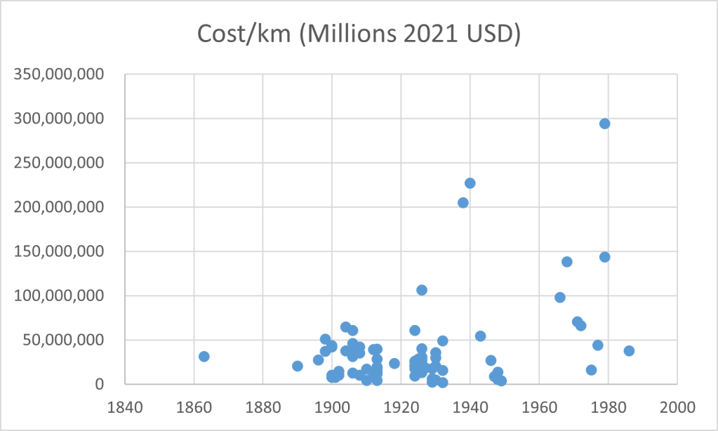 Prior to the First World War, there does not seem to be a marked difference in the costs of projects on both either side of the Atlantic: we can find many examples of American and European lines being built for well below $50m per kilometre. Construction costs tend to cluster around the level pretty much everywhere. In the interwar period, we start to see much greater dispersion of costs, with some of the lines built in the United States in the 1930s New Deal Era racking up much higher unit construction costs. In the postwar period, we see even greater dispersion of costs, with some of American projects, such as BART and MARTA in Atlanta, incurring eye-watering high construction costs. The MARTA East-West Line that opened to the paying public in 1979 cost an astonishing $294,444,444 per kilometre to build. The Los Angeles subway line that opened to paying passengers in 1993 and which is now known as the B Line (it was originally called the Red Line), cost $268,181,818 per kilometre to build.