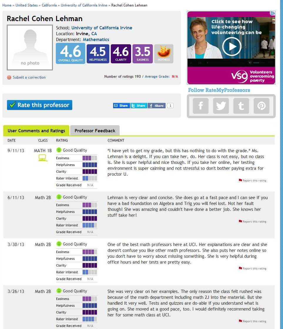 This cultural difference has had an impact on the attempts to popularize websites that allow students to evaluate professors. In North America, RateMyProfessor has been popular for about a decade. This website allows students to grade professors according to a variety of criteria. It also has an infamous chilli pepper icon that students can use to indicate that a teacher is physically attractive. Millions of students have rated one or more of their professors on RateMyProfessor Personally, I find that RateMyProfessor ratings correspond to my own impression of academics provided there is a good sample size (e.g., ratings from more than ten students). Every academic on that website has at least one negative review from a student with a grievance. The key thing is to see what the average rating is. When I was an undergraduate in the 1990s, the student government at my university produced a printed document called the “anti-calendar” that provided student ratings of professors and individual courses. As with RateMyProfessor, every prof, even the most brilliant lecturer, had one or two bad evaluations, perhaps from the guy they caught cheating. The key thing to look for was the average rating. Here is a sample a rating, selected at random.