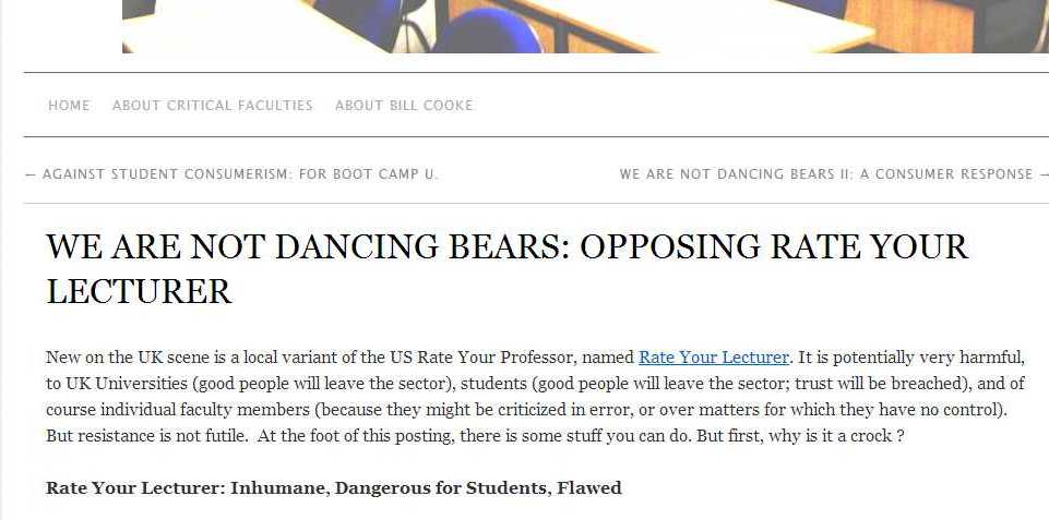 When this website went live there were expressions of outrage by some UK academics. The really interesting thing is that very few British students have rated any of their university teachers. The website has been online for months now and few academics have been rated yet. (I’ve checked out a few departments and universities I know).
