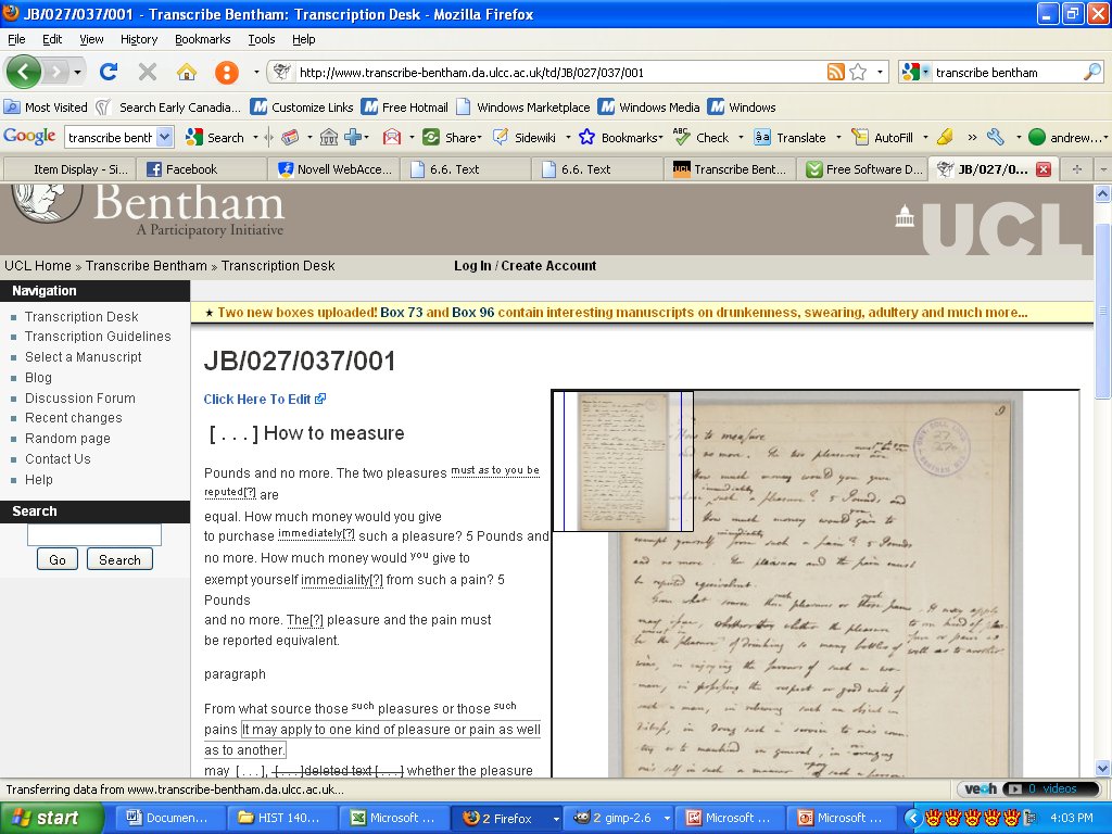 Scripto uses the wikimedia api and editing interface and some additional scripting to capture the transcriptions and pass them back to the CMS. Thus, it provides for all of the versioning and notation capacities of wikimedia, but makes the current version of the transcription available to the main CMS for search and association with the rest of the standardized archival metadata. This is one of the differences between Scripto and the system that Transcribe Bentham is using; the Bentham project is totally contained within the wikimedia interface and has no way to export standardized metadata. Additionally, the Transcribe Bentham project has created an interface for TEI mark-up (Text Encoding Initiative) of the texts. The people at the Scripto project have not added this modification to their use of wikimedia, but since the tool is open source, another programmer could add that modification on a individual basis or could release a plugin for our system.